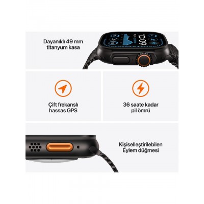 Apple Watch Ultra 2 [GPS + Cellular 49 mm] Akıllı Saat, Sağlam Titanyum Kasa Spor Saati ve [renk] [kordon]. Fitness Takibi, Hassas GPS, Eylem Düğmesi, Ekstra Uzun Pil Ömrü, Parlak Retina Ekran Apple Watch Ultra 2 [GPS + Cellular 49 mm] Akıllı Saat, Sağlam Titanyum Kasa Spor Saati ve [renk] [kordon]. Fitness Takibi, Hassas GPS, Eylem Düğmesi, Ekstra Uzun Pil Ömrü, Karbon Nötr NEDEN APPLE WATCH ULTRA 2 SATIN ALMALISINIZ? — Spor ve macera için mükemmel saat. Koşucular, bisikletçiler, yüzücüler, doğa yürüyüşçüleri, dalgıçlar ve daha fazlası için gelişmiş özellikler. Dayanıklı titanyum kasa şimdi pürüzsüz bir dokuya sahip siyah renk seçeneği. Süper parlak Hep Açık Retina ekran. Çift frekanslı, hassas, ileri seviye GPS.* Güçlü sağlık, güvenlik ve bağlantı özellikleri.* Ve normal kullanımla 36 saate kadar, Düşük Güç Modu’nda 72 saate kadar pil ömrü.* ÇOK DAYANIKLI, İNANILMAZ DONANIMLI — Aşınmaya karşı dayanıklı 49 mm titanyum kasa. Safir ön kristal. Geniş Digital Crown ve birçok farklı işlevi anında kontrol imkanı sunan, kişiselleştirilebilen Eylem düğmesi. MIL-STD 810H sertifikası.* 100 metre suya dayanıklılık.* ÖZGÜRLÜK ÇAĞRISI — Hücresel bir servis tarifesiyle iPhone’unuz yanınızda olmasa bile mesaj atıp arama yapın. Favori müziklerinizi ve podcast’lerinizi online dinleyin. Harita ile yol tarifi alın. ANTRENMANLARINIZI MAKSİMUMA ÇIKARIN — Antrenman uygulaması Kalp Atış Hızı Bölgeleri, özel antrenmanlar ve antrenman yükü gibi gelişmiş ölçümler, görünümler ve deneyimler sunuyor. Bu sayede antrenmanlarınızın zaman içinde vücudunuzu nasıl etkilediğine dair önemli bilgiler alabiliyorsunuz. KOŞUCULAR İÇİN — Çift frekanslı, hassas, ileri seviye GPS. Otomatik pist algılama. Ne kadar verimli koştuğunuzu anlamanıza yardımcı olan gelişmiş koşu ölçümleri. Isınma, toparlanma ve soğuma aralıkları ekleyerek kişiselleştirebilen antrenmanlar. BİSİKLETÇİLER İÇİN — Güçlü ölçümlerle bisiklet deneyiminizi bir üst seviyeye çıkarın. Sürüş hızınızı, kalp atış hızınızı ve yüksekliğinizi antrenman görünümlerinde inceleyin. Saatinizden başlattığınız bir bisiklet antrenmanı, daha rahat görebilmeniz için otomatik bir şekilde iPhone’unuzun ekranında Canlı Etkinlik olarak gösteriliyor. Fonksiyonel Eşik Gücü ve kadansı görebilmek için güç ölçer gibi Bluetooth aksesuarlarına doğrudan bağlanın. DOĞA YÜRÜYÜŞÇÜLERİ İÇİN — Çevrimdışı Haritalar sayesinde konumunuzu sadece Apple Watch’unuzu kullanarak takip edin. Üstelik Pusula uygulaması anlık rota, yükseklik, enlem ve boylam gibi temel navigasyon araçlarıyla dolu. En son nerede operatör sinyali aldığınızı bulun. Pusula Ara Noktaları ile konumunuzu işaretleyin. Geriye Dönüş özelliğini kullanarak geçtiğiniz yerleri kaydedin ve adımlarınızı geriye doğru takip edin. YÜZÜCÜLER İÇİN — Havuz yüzücüleri için otomatik kulaç algılama, tur sayma, tur süreleri, setler ve özel antrenmanlar. Açık su yüzücüleri, antrenman özetlerinde rotalarını görebiliyorlar. Gelgit uygulamasıyla dünya çapında 115.000’den fazla plajda gelgit durumlarını inceleyin. DALGIÇLAR İÇİN — Oceanic+ uygulamasıyla tam donanımlı dalış bilgisayarı yetenekleri. 40 metreye kadar derinliği ve su sıcaklığını algılama özelliği. EN13319 sertifikalı. GELİŞMİŞ SAĞLIK VE GÜVENLİK ÖZELLİKLERİ — EKG çekin.* Düzensiz kalp ritmi için bildirimler alın.* Gece boyunca alınan sağlık ölçümlerinizi görün. Yaşam Bulguları uygulamasıyla uyku durumunuzu takip edin ve gece boyunca alınan kalp atış hızı ve solunum hızı gibi pek çok sağlık ölçümünüzü görün.* Sert bir düşüş veya ciddi bir araba kazası gibi durumlarda otomatik olarak acil servise bağlanın. Ve sadece bir düğmeye basarak acil yardıma ulaşın veya sireni etkinleştirin.* * YASAL AÇIKLAMALAR — Bunlar ana ürün özelliklerinin bir özetidir. Daha fazla bilgi * YASAL AÇIKLAMALAR — Bunlar ana ürün özelliklerinin bir özetidir. Daha fazla bilgi edinmek için yukarıya göz atın.