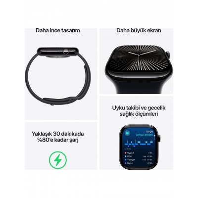 Apple Watch Series 10 [GPS + Cellular 42 mm] [Renk] Kasa Akıllı Saat ve [Renk] [kordon]. Fitness Takibi, EKG uygulaması, Hep Açık Retina Ekran, Suya Dayanıklı Tasarım Apple Watch Series 10 [GPS + Cellular 42 mm] [Renk] Kasa Akıllı Saat ve [Renk] [kordon]. Fitness Takibi, EKG Uygulaması, Hep Açık Retina Ekran, Karbon Nötr Apple Watch Series 10 [GPS 42 mm] [Renk] Kasa Akıllı Saat ve [Renk] [kordon]. Fitness Takibi, EKG uygulaması, Hep Açık Retina Ekran, Suya Dayanıklı Tasarım Apple Watch Series 10 [GPS 42 mm] [Renk] Kasa Akıllı Saat ve [Renk] [kordon]. Fitness Takibi, EKG Uygulaması, Hep Açık Retina Ekran, Karbon Nötr NEDEN APPLE WATCH SERIES 10 SATIN ALMALISINIZ? — Yüzde 30 daha fazla alan sunan daha büyük ekran.* Daha ince, daha hafif ve daha konforlu tasarım.* Paha biçilemez bilgiler sunan gelişmiş sağlık ve fitness özellikleri.* İhtiyacınız olduğunda yardım almanızı sağlayan güvenlik özellikleri.* Daha hızlı şarj özelliğiyle yaklaşık 30 dakikada yüzde 80 şarj.* GELİŞMİŞ SAĞLIK BİLGİLERİ — EKG çekin. Ne zaman isterseniz.* Kalp atış hızınız yüksek veya düşük olduğunda ya da kalp ritminiz düzensizleştiğinde bildirim alın.* Âdet döngünüzü anlayın ve geriye dönük yumurtlama zamanı tahminlerine erişin.* Yaşam Bulguları uygulamasıyla gece boyunca alınan kalp atış hızı ve solunum hızı gibi pek çok sağlık ölçümünüzü görün.* Yaşam Bulguları uygulamasıyla uyku durumunuzu takip edin ve gece boyunca alınan kalp atış hızı ve solunum hızı gibi pek çok sağlık ölçümünüzü GÜÇLÜ BİR FİTNESS KOÇU — Yaşam tarzınıza uyacak şekilde kişiselleştirilebilen Aktivite Halkalarıyla tüm hareketlerinizi ölçün. Antrenman uygulamasıyla çeşitli antrenmanlar için gelişmiş ölçümlere ulaşın. Antrenman yükü ile antrenmanlarınızın yoğunluğun takip edin. Ve sudaki aktiviteleriniz için derinlik ve su sıcaklığı sensörlerini kullanın. HÜCRESEL BAĞLANTI — Hücresel bir servis tarifesiyle, iPhone’unuz yanınızda olmasa bile mesaj gönderin, arama yapın ve online müzik dinleyin.* BAĞLANTIDA KALIN — Hareket halindeyken de mesaj gönderin, aramaları yanıtlayın, müzik ve podcast dinleyin, Siri’yi kullanın ve bildirim alın. Apple Watch Series 10 (GPS), iPhone’unuz veya Wi-Fi üzerinden bağlantıda kalmanızı sağlıyor. İNOVATİF GÜVENLİK ÖZELLİKLERİ — Ciddi bir araba kazası veya sert bir düşüş gibi durumlarda sizi acil servise bağlayan Düşme Algılama ve Trafik Kazası Algılama özellikleri. Acil SOS, sadece bir düğmeye basarak acil yardıma ulaşmanızı sağlıyor.* Durum Denetleme, varış noktanıza ulaştığınızda sevdiğiniz birine otomatik olarak bildirim gönderiyor.* İNANILMAZ DAYANIKLILIK — Çatlamaya karşı dayanıklı ve IP6X toza dayanıklılık derecesine sahip, 50 metre suya dayanıklı tasarım.* KARBON NÖTR — Apple Watch Series 10’un kasa malzemesini veya renk seçeneklerini karbon nötr olacak şekilde yapılandırabiliyorsunuz. Apple’ın çevre konusundaki kararlılığı hakkında daha fazla bilgi için apple.com/tr/2030 sayfasını ziyaret edin. TEK KELİMEYLE UYUMLU — Apple servisleriyle ve aygıtlarınızla kusursuz bir uyum içinde çalışıyor.* Mac’inizin kilidini otomatik olarak açabiliyorsunuz. Tam Konum Bulma özelliği, desteklenen iPhone modellerinde iPhone’unuzun yaklaşık uzaklığını ve bulunduğu yönü gösteriyor.* KOLAYCA KİŞİSELLEŞTİRİLEBİLİR — Farklı stiller, materyaller ve renklerle tasarlanan kayışlar ve tamamen kişiselleştirilebilir kadranlar sayesinde saatinizi ruh hâlinize uygun şekilde veya anlık olarak değiştirebiliyorsunuz. * YASAL AÇIKLAMALAR — Bunlar ana ürün özelliklerinin bir özetidir. Daha fazla bilgi edinmek için aşağıya göz atın. * YASAL AÇIKLAMALAR — Bunlar ana ürün özelliklerinin bir özetidir. Daha fazla bilgi edinmek için yukarıya göz atın.
