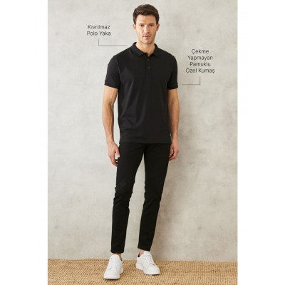 Altınyıldız Classics AC&Co / Altınyıldız Classics Erkek Çekmeyen Pamuklu Kumaş Slim Fit Dar Kesim Simsiyah Kıvrılmaz Polo Yaka T-