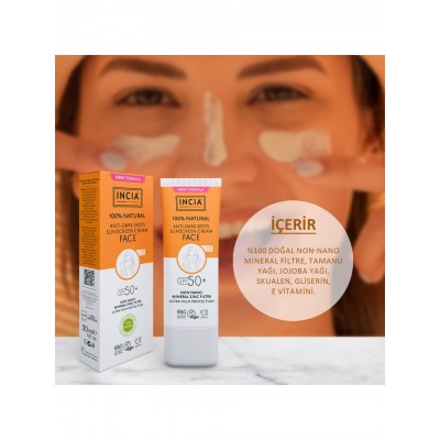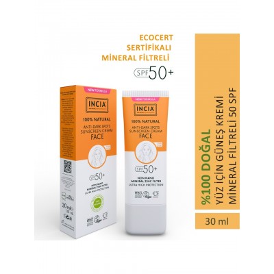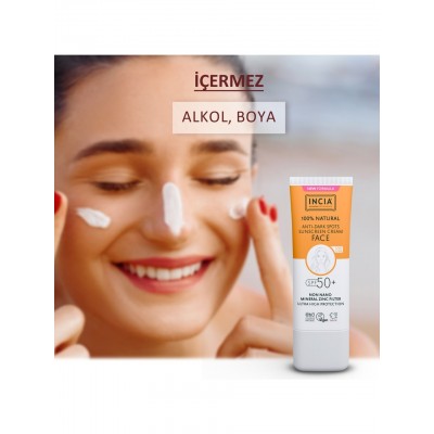 INCIA %100 Doğal Yüz Güneş Kremi Leke Karşıtı Aydınlatıcı Mineral Filtre UVA1 UVA2 UVB SPF 50+